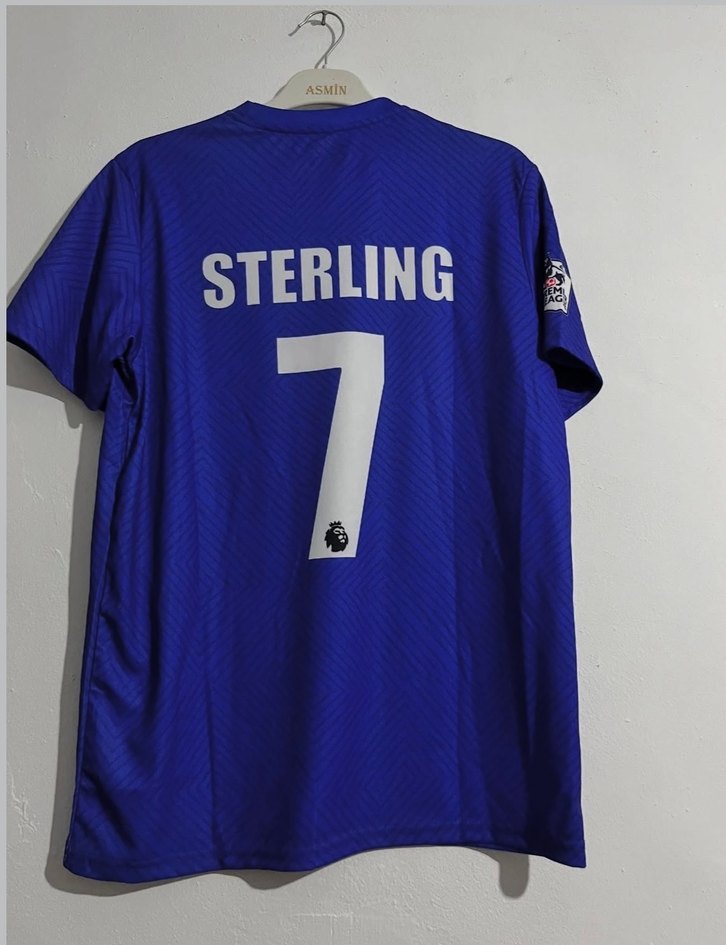 Parlak mavi sentetik kumaştan, kısa kollu, bisiklet yaka, baskılı "STERLING 7" yazılı, düğmeli, fit kesim erkek spor forması. ♂️