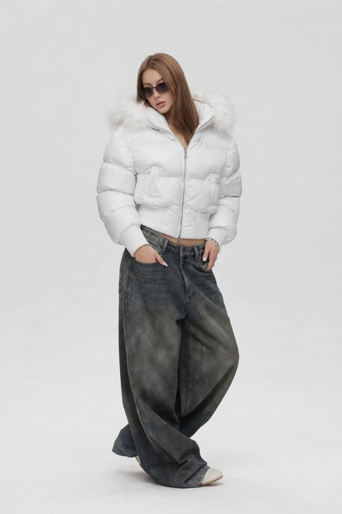 Bu beyaz, parlak ve kürklü kapüşonlu kış montu, uzun kollu ve straplez yaka detaylarına sahip. Sokak stilini yansıtan, rahat ve vücuda oturan midi boy mont.