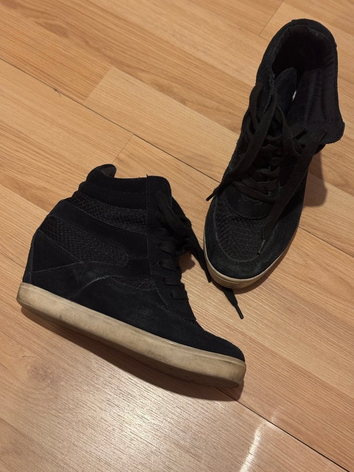Siyah renkte, bağcıklı ve dolgu topuklu kadın botları. Kauçuk malzemeden üretilmiştir ve günlük sokak stili için uygundur.