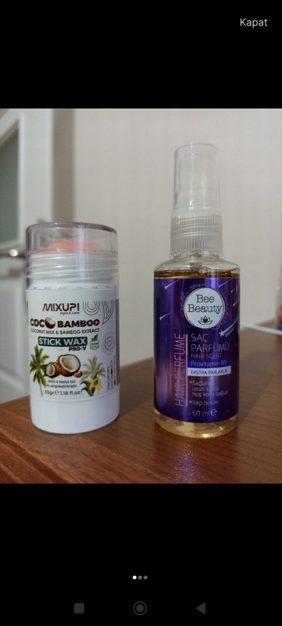 Bee Beauty saç parfümü provitamin B5 ile ekstra parlaklık ve hoş koku sağlar. Mixup Stick Wax hindistancevizi sütü ve bambu özü ile saç şekillendirir, vanilya ve hindistancevizi kokuludur. Her iki ürün etkili saç bakımı sunar. Saç waxı bir iki kez kullanılmıştır alt kısmindan çevirilerek açılıyor