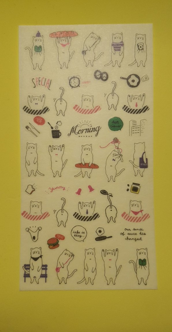 Pastel sarı renkte, bohem tarzda, eğlenceli kedi desenleri ve baskılı yazılar içeren sticker