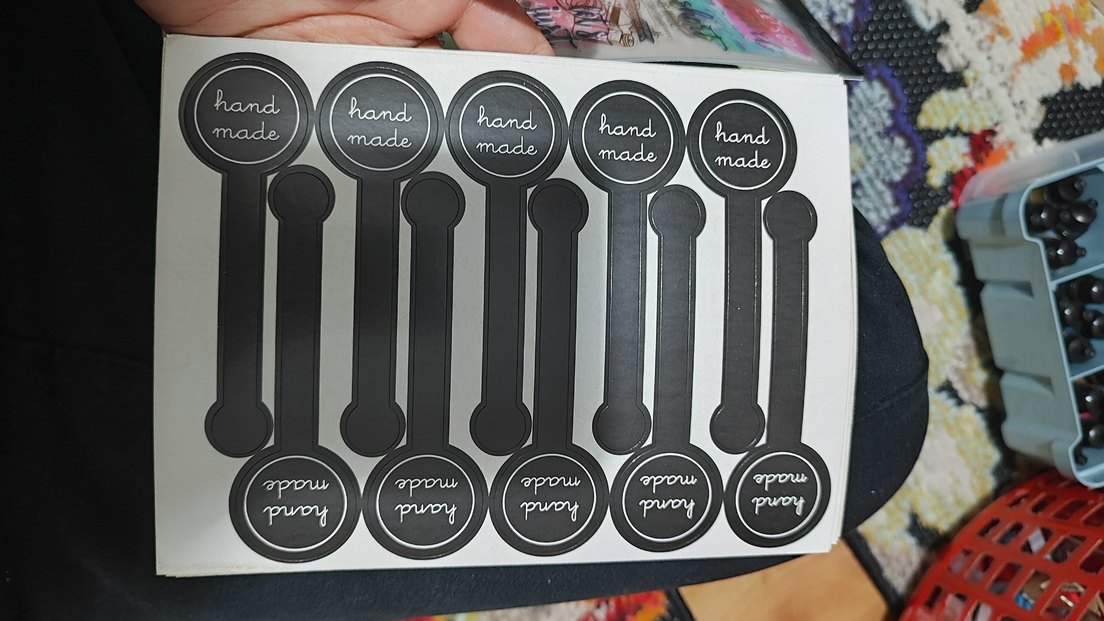 Üzerinde 'hand made' yazan siyah ve gri plastik etiketler, el yapımı ürünleri etiketlemek için uygundur. ️9 adet vardır.