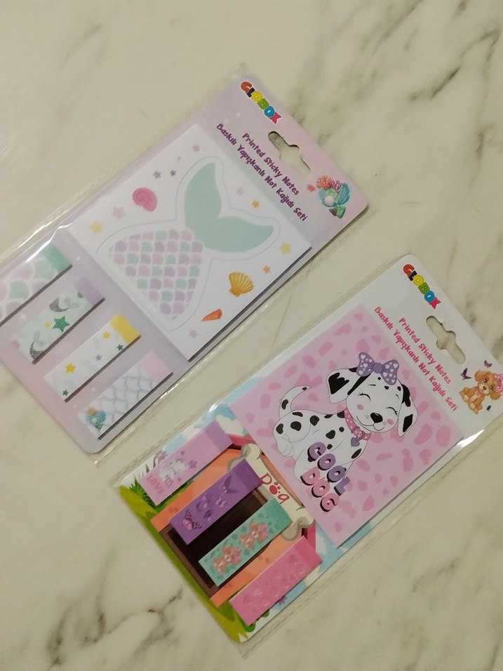 Pastel pembe renklerde, denizkızı kuyruğu ve benekli yavru köpek desenli yapışkan not seti, 2 lı fiyattır