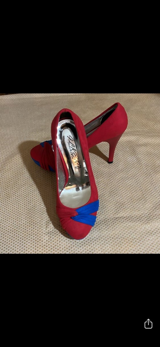 Kırmızı yüksek topuklu stiletto, mavi baskılı detaylar ve tokalı tasarım ile cesur ve çağdaş bir stil sunar, romantik akşamlar için uygun. Topuk boyu 10 cm iç ölçüsü 23 cm