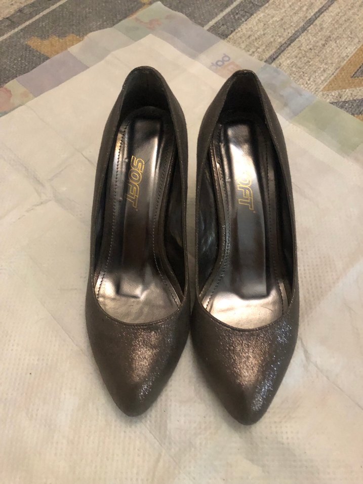 Simligri renkte, kauçuk malzemeden stiletto topuklu kadın ayakkabısı. Modern klasik tarzda, romantik akşamlar için uygundur.