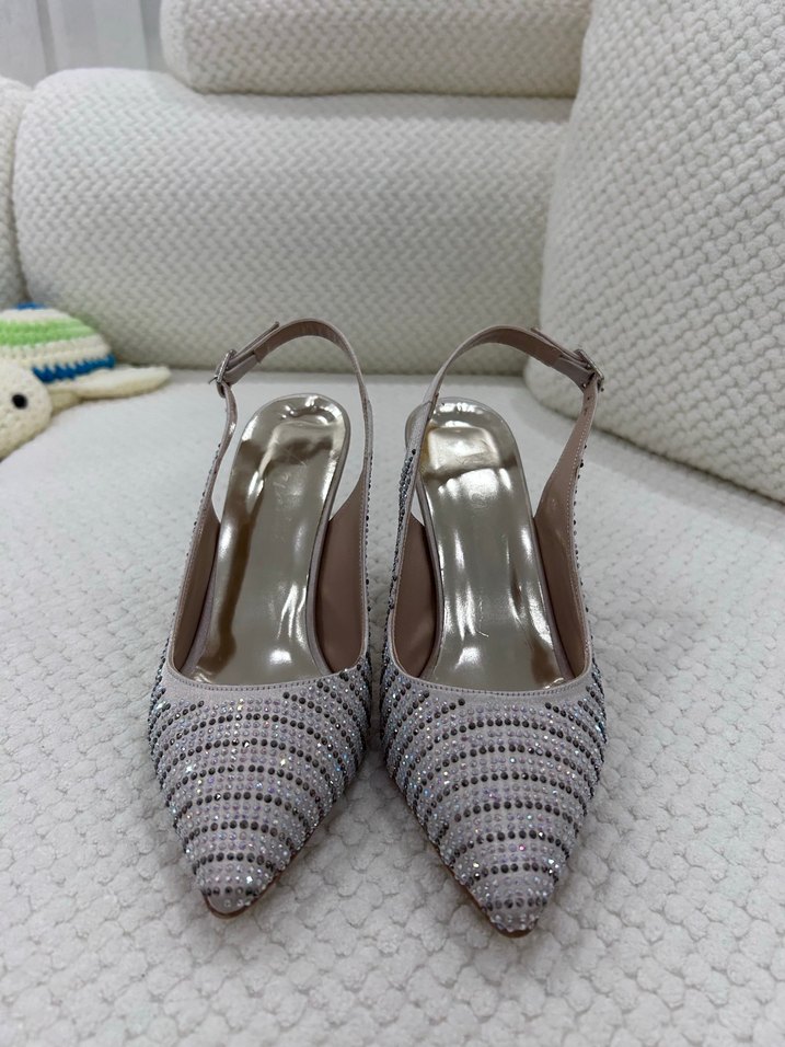 Sentetik kumaştan tokalı bantlı stiletto topuklu kadın ayakkabısı. Düğünler için şık ve çağdaş tasarım.