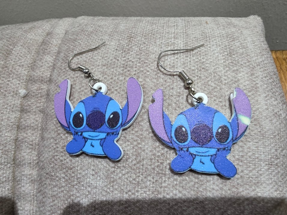 Renkli nakışlı ve boncuk detaylı, mavi karakter figürlü pop kültür çocuk küpeleri.