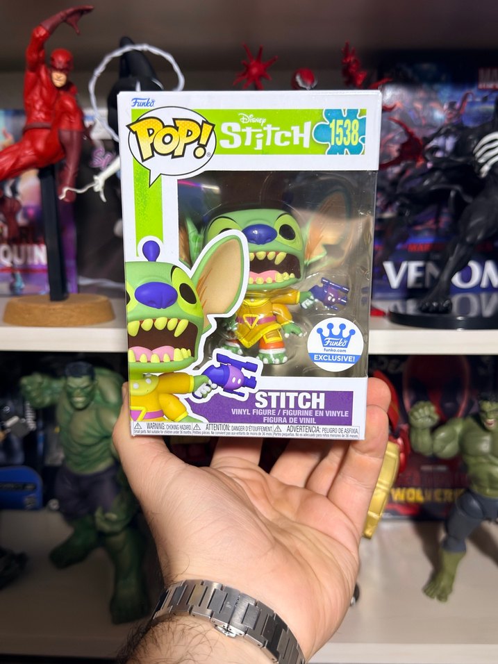 Renkli yeşil kıyafetli Stitch karakteri, mor aksesuar tutuyor. Vinil malzemeden yapılmış, özel sürüm koleksiyon figürü.