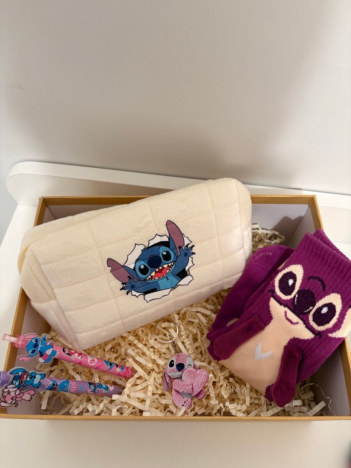 Pastel mor renkte, nakışlı triko çocuk uyku aksesuar seti; küçük çanta, peluş oyuncak ve uyku ile ilgili diğer ürünleri içerir.