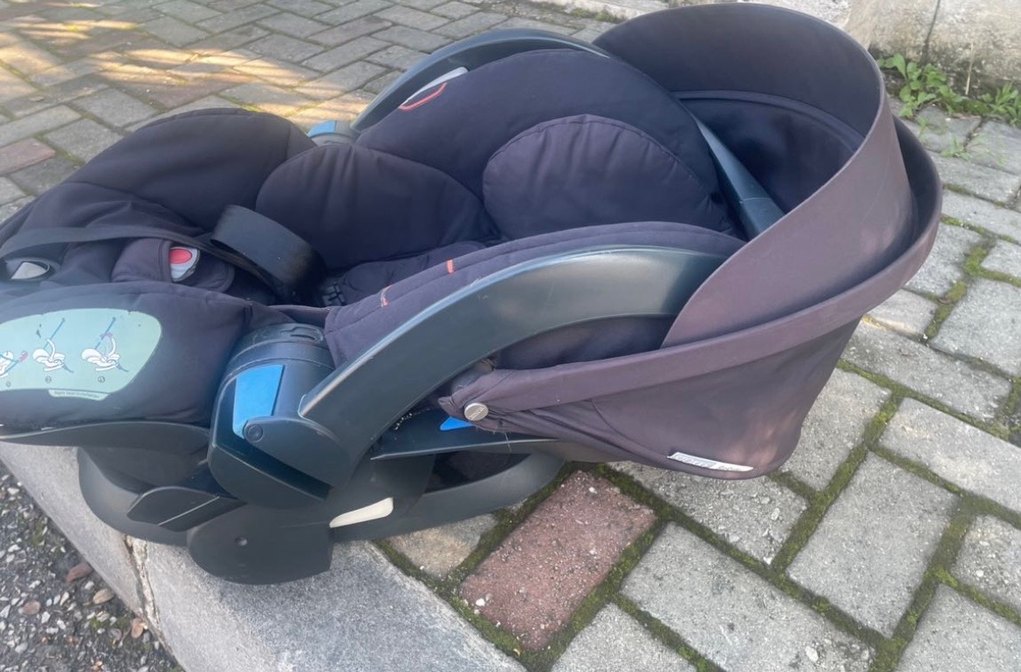 Koyu gri renkli, yumuşak kumaşlı ve taşıma kolu bulunan bebek oto koltuğu. Rahat ve güvenli kullanım sağlar.