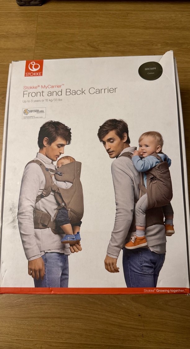 Stokke MyCarrier, 3 yaşa kadar veya 15 kg'a kadar çocuklar için önden ve arkadan taşıma olanağı sunar. Kahverengi ve gri renklerde, konforlu ve destekleyici tasarıma sahiptir.