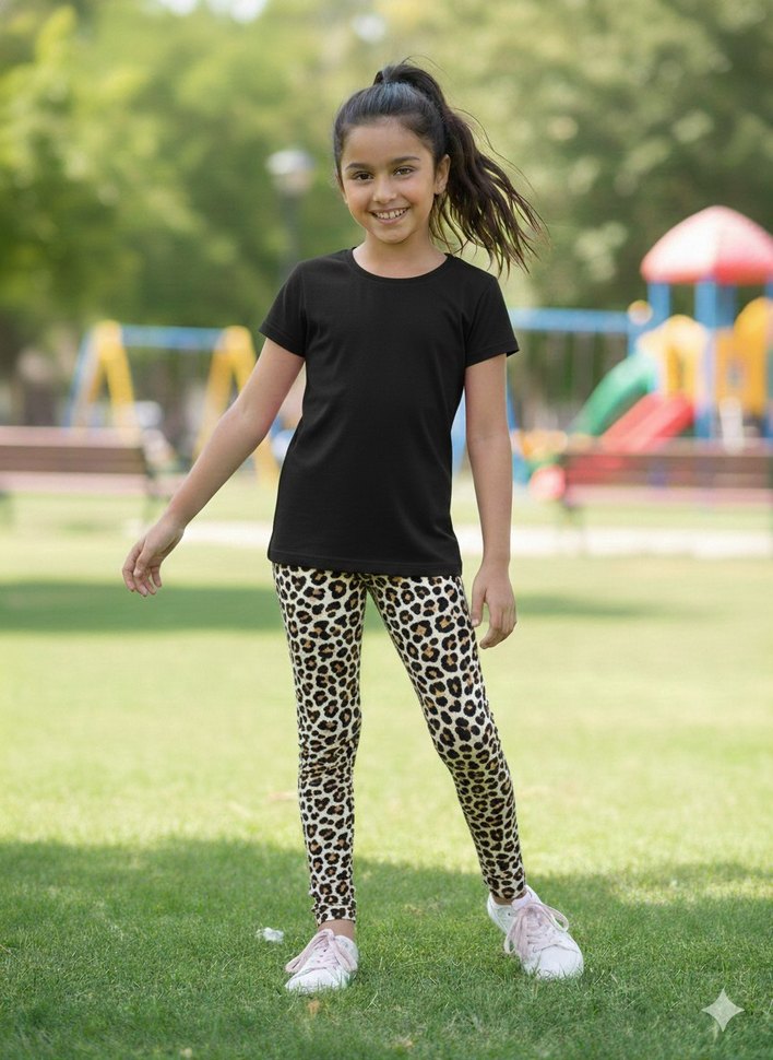 Kızlar için leopar desenli, koyu siyah renkli, yumuşak sentetik kumaştan yapılmış, rahat kesimli tayt.