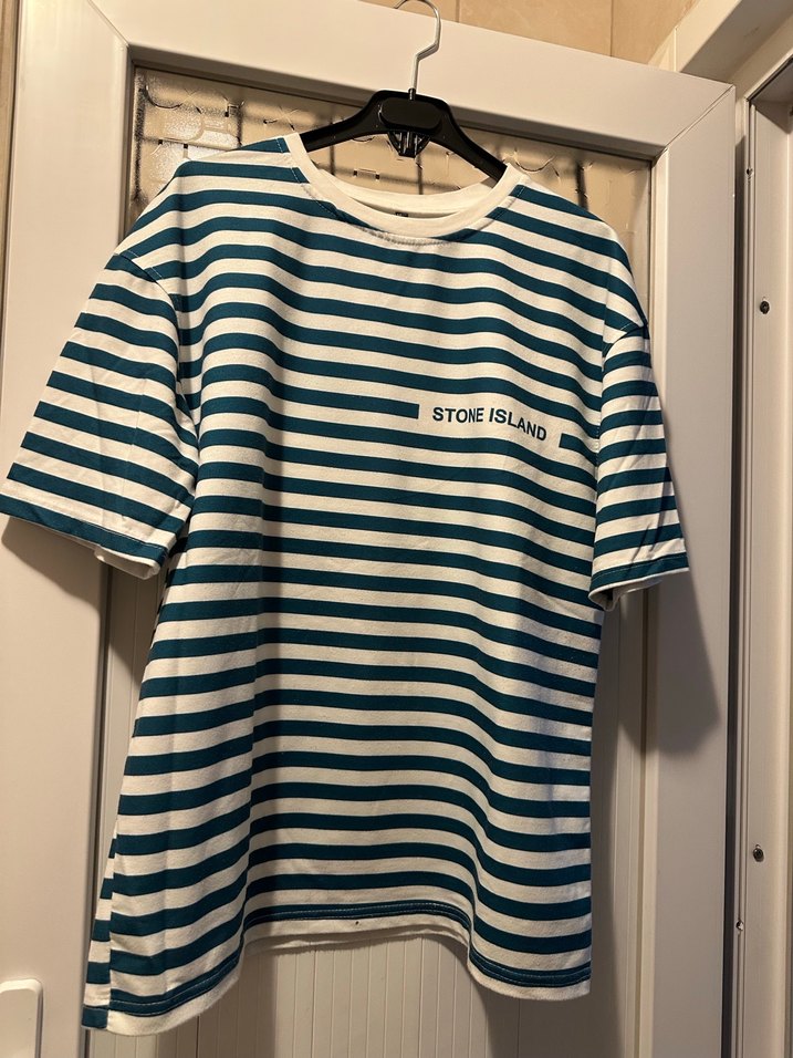 Stone Island marka, kısa kollu, bisiklet yaka, bol kesim erkek çocuk tişörtü. Hafif mavi çizgili deseni ve baskılı logo ile trend sokak stili sunar. ✨