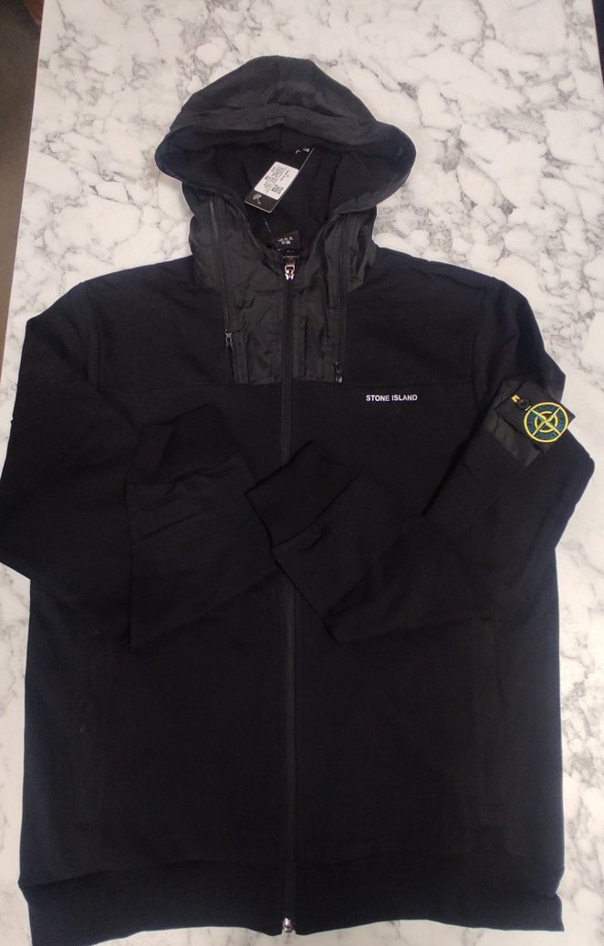Stone Island siyah kapüşonlu erkek rüzgarlık, uzun kollu ve fermuarlı. Yumuşak ve sıcak fleece kumaştan, rahat kesim, dış mekan kullanımı için uygun. ️