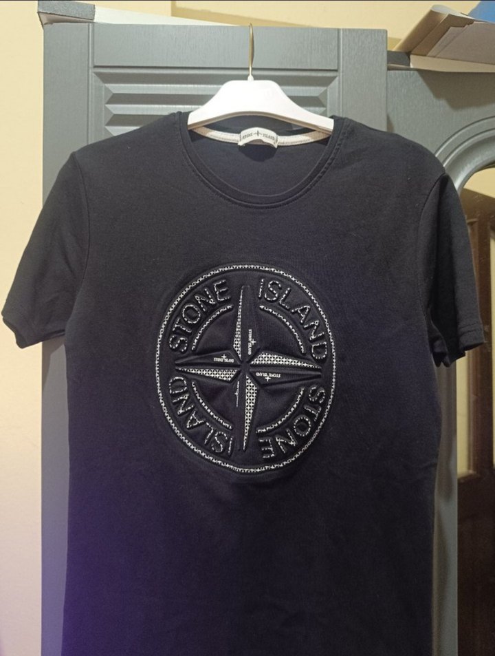 Siyah Stone Island erkek tişört, kısa kollu ve yuvarlak yakalıdır. Gevşek kesimi ve önünde metal işlemeli payetli logo bulunur. Açık hava için uygundur.