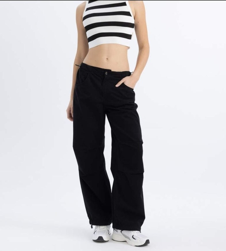 Sadece 2 kere giydim. Ölçüleri en son fotoğrafta var. %100 pamuk, gabardin pantolon diye geçiyor hışır hışır bir dokusu yok, kumaşı gayet güzel. Fazlalıktan satıyorum. İlk fotoğraftaki ürünün aynısı sadece düğmeli değil çıtçıtlı model, 3. sırada çıtçıtlı modelin de fotoğrafı var. Beli lastikli, aynı zamanda hem beli hem paçası ayarlanabiliyor yanlardan. İsterseniz düşük bel olarak da kullanabilirsiniz. Tam beden bence, ama bol seviyorsanız 32 bedenseniz de alabilirsiniz.