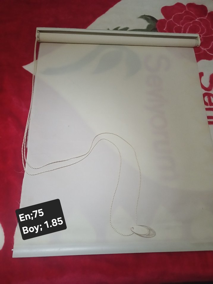 Yaklaşık 1,85 metre uzunluğunda ve 75 cm genişliğinde. güneşlik formatında perde. yanda ip cikmaları mevcut yikanmasi lazim. ben toprlamayı beceremedgm icin bozmuyorm yikamaya atmiyorm ekru renkte