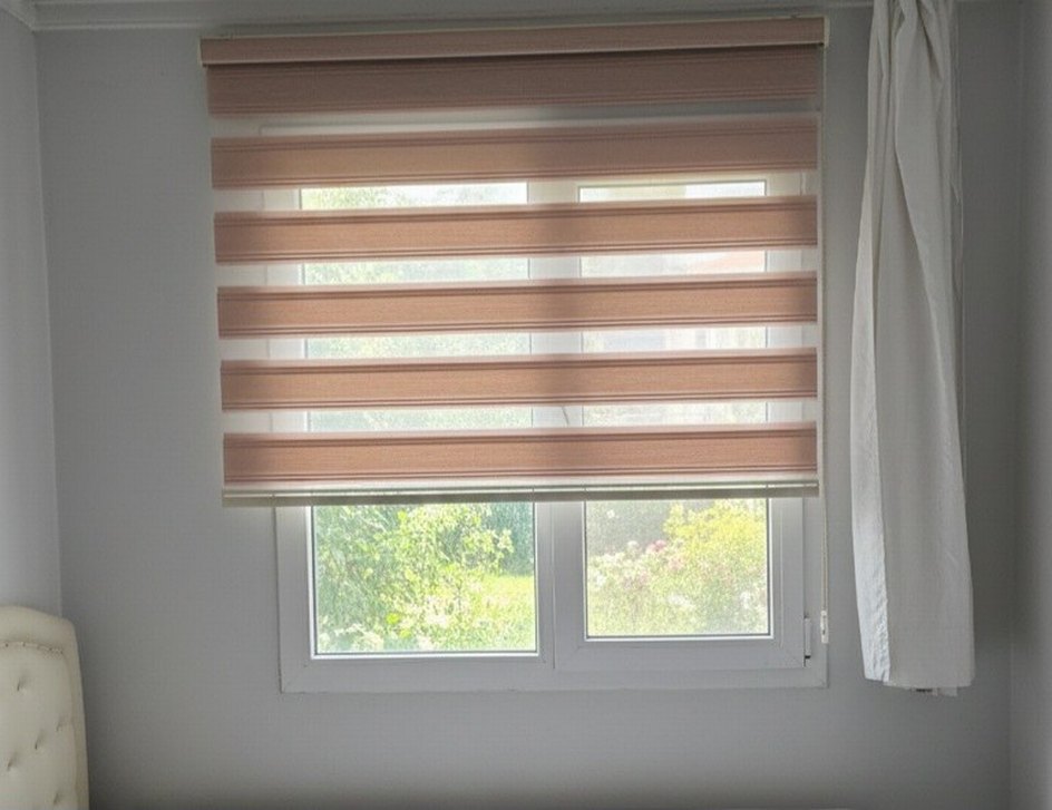 Açık bej renkte, çizgili desenli ve modern stile sahip stor perde, yumuşak doğal ışığın içeri girmesini sağlar. farklı açıdan fotoğraf yoktur. çekip kaldırdım. pudra pembesi tonunda