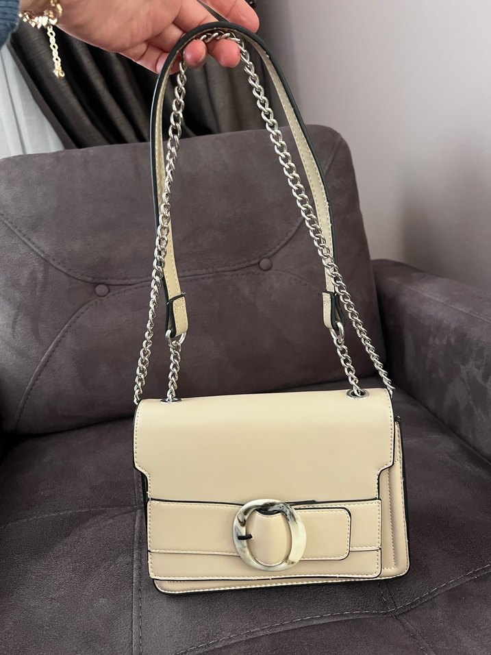 Bej deri çanta, zincir detaylı ve çağdaş yılan derisi desenine sahip, günlük kullanıma uygun şık bir parça. Bir kez kullanıldı