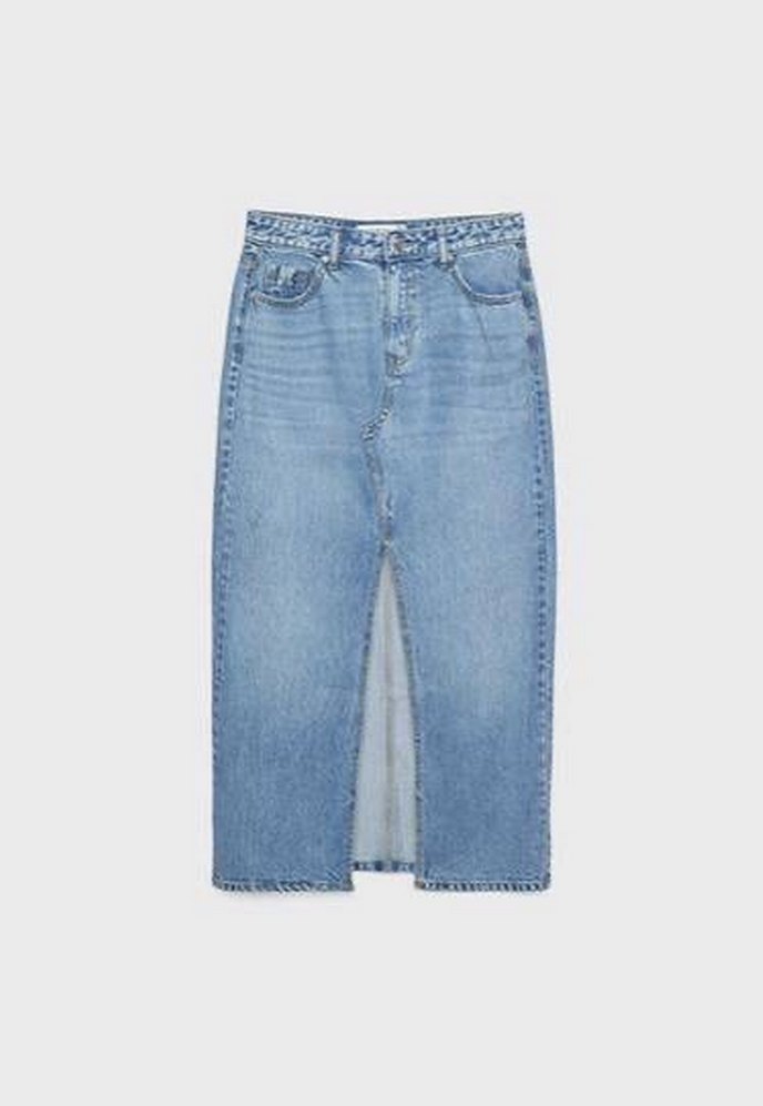 Kadınlar için normal kesim, kemerli midi kot etek. Pastel mavi renkte ve hareket kolaylığı için ön yırtmaçlıdır. Günlük rahat kullanıma uygundur.