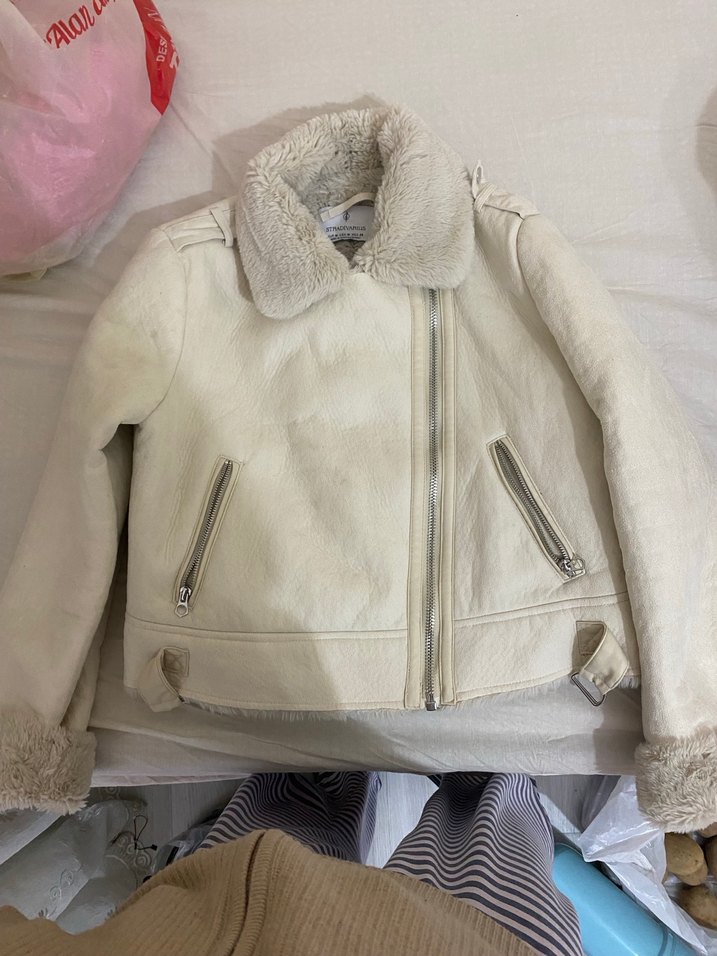 Beyaz deri ceket, kürk detaylı, keskin yaka ve oturan kesime sahiptir. Uzun kollu, midi boyda, günlük sokak stiline uygundur. (2-3 kez giyildi, defosuz)