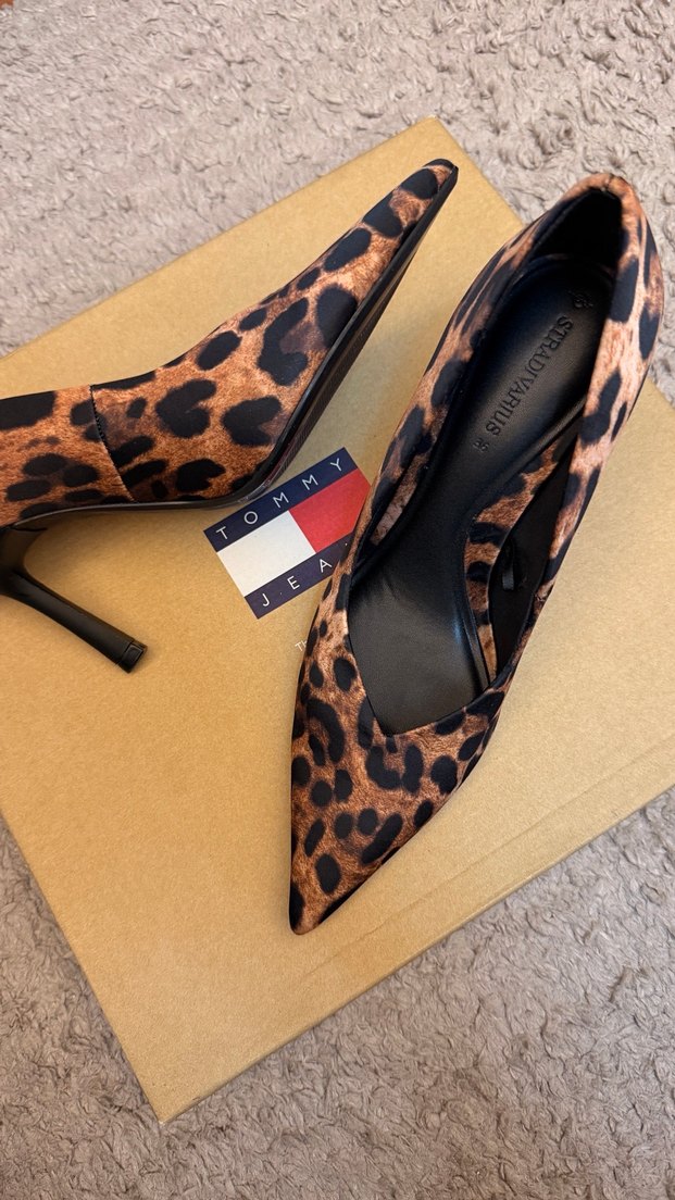 Kahverengi, leopar desenli, kürklü detaylı, yüksek topuklu stiletto. Kauçuk malzemeden üretilmiş, çağdaş Paris tarzı ayakkabı.