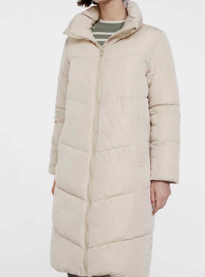 Bej renkli, uzun kesim kadın kışlık mont, yüksek yakalı ve fermuarlı tasarıma sahiptir. Rahat kalıp ve uzun kolludur, günlük sokak stili için uygundur. ❄️