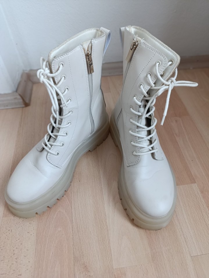 tertemiz yurtdışı alım orjinaldir Beyaz deri, yüksek topuklu ve bağcıklı kadın botları. Yanlarda fermuar ve günlük kullanıma uygun minimalist, düz tasarıma sahiptir.