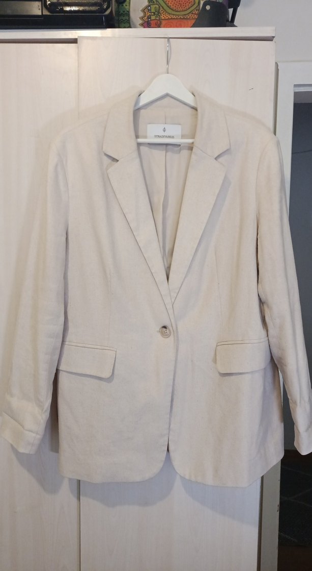 Bej keten kumaştan, notlu yaka ve uzun kollu, normal kesim midi blazer. Düz ve pastel tonu ile ofis ortamına uygun, sade normcore tarzda. STRADİVARİUS L Beden. oldukça iyi durumda