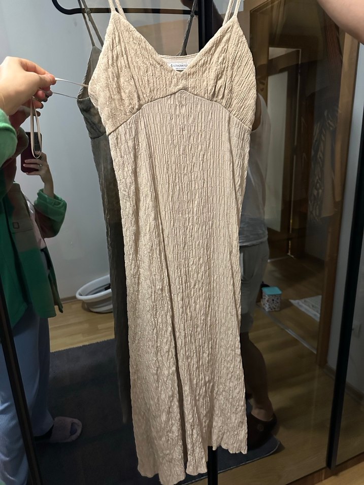Bej uzun keten elbise, drapeli ve vücuda oturan kesim. Askılı ve kolsuz, bohem tarzda günlük kullanıma uygun. Defosuz