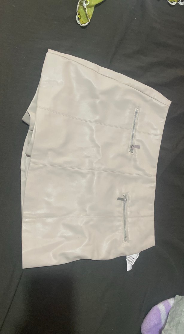 Fermuarlı cepleri olan, deriden yapılmış bej renkli, mini ve vücuda oturan etek. Sokak stili ve açık hava için uygun sade tasarım. Şort etektir