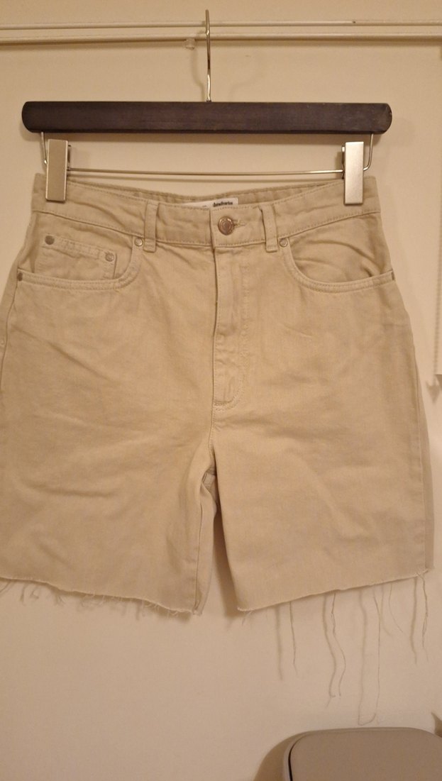 Yumuşak kumaştan yapılmış bej mini şort, rahat kesimi ve ham kenar detaylarıyla gündelik sokak stili için uygundur. #stradivarius #jean #jeansort