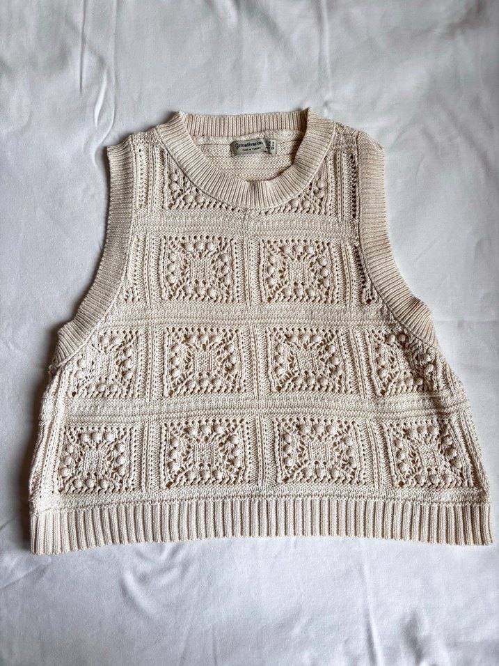 İki kez giydim, yepyeni hiçbir sorunu yok Bej renk, yuvarlak yaka, kolsuz, bol kesim örgü kadın süveter.