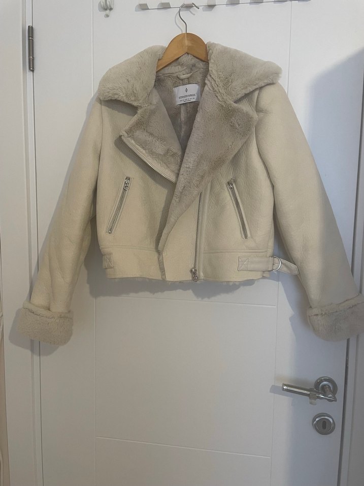 Bej süet kumaştan yapılmış, kürk detaylı ve uzun kollu bu kadın ceket, notched yaka ve fermuarlı ceplere sahiptir. Günlük kullanıma uygun, midi boyda ve dar kesimdir. 2 kez giyildi. Bedeni dar geldiği için satıyorum.iç kürk kısmında renk değişimi mevcut içine giydiğim sweatshirt ün rengi çıkmış. Yıkanınca çıkacak türden bir renk değişimi fiyata yansıtılmıştır