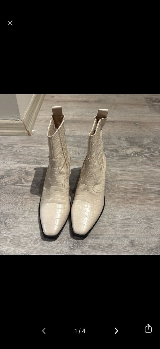 Bej yılan desenli deri kadın botlar, blok topuklu ve tokalı detaylara sahip, trend günlük stil için uygundur.