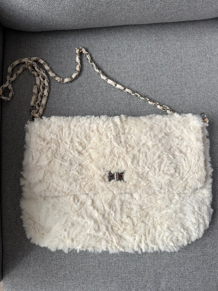 Beyaz kurklu canta. Gunluk ve abiye kullanima uygun. Hic kullanilmadi, dolapta kalmasindan dolayi deri kisimlarinda hafif deformeleri var.