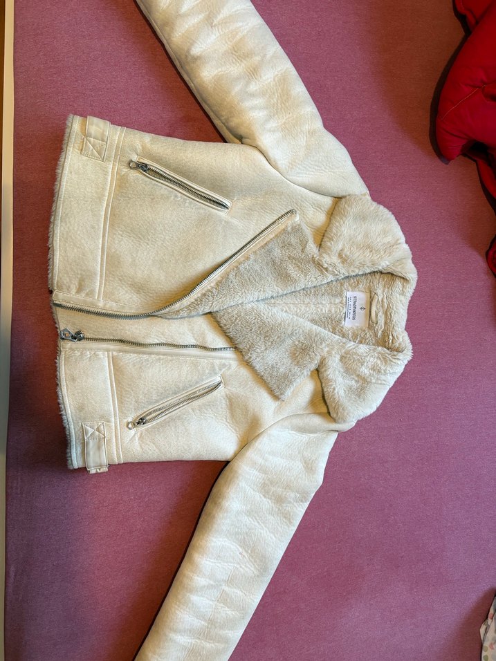 Beyaz süet kumaştan, fermuarlı, uzun kollu, normal boy, dar kesim kadın ceket. Notlu yaka ve iç kısmı sıcak tutan astar içerir. Cok iyi kullanildi hic bir defosu yok.