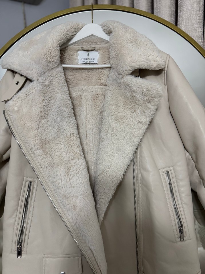 Bej renkli, kürklü detaylı deri kadın ceket. Notlu yaka ve uzun kollu, normal midi boyda, rahat kesime sahip sokak stili. Son fotoğrafta minicik soyulması var
