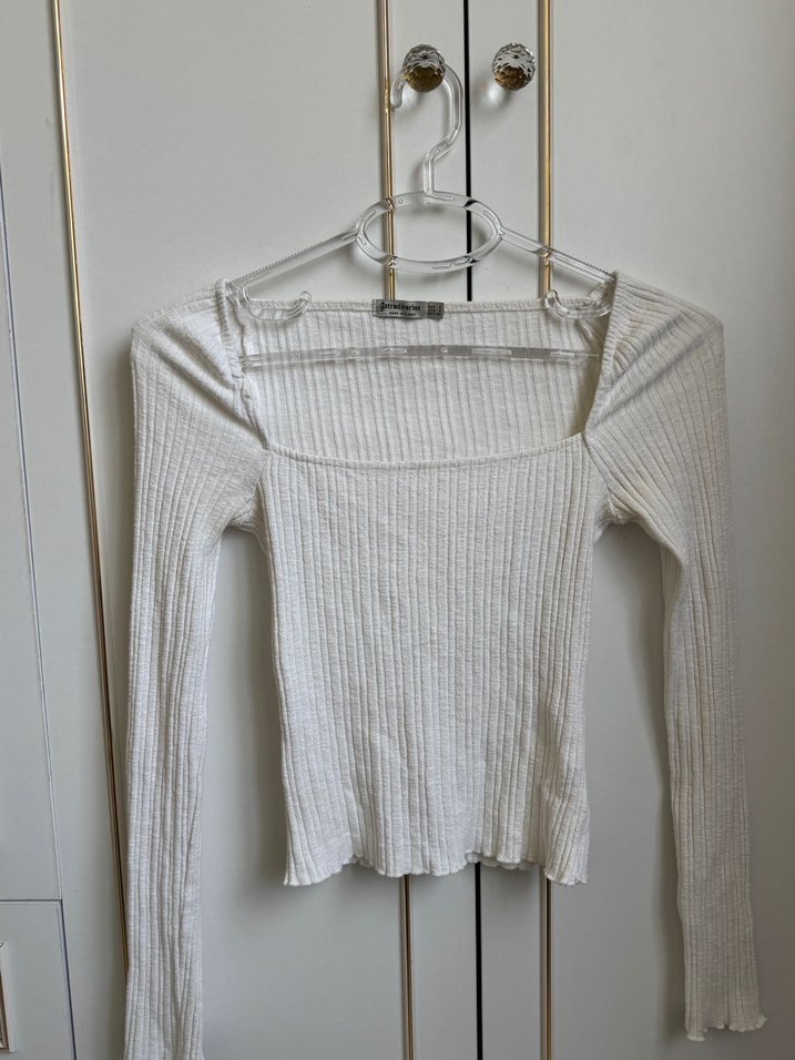 Yumuşak keten kumaştan, uzun kollu ve yuvarlak yakalı beyaz triko bluz. Vücuda oturan kesimi ve midi boyuyla gündelik sokak stiline uygun.