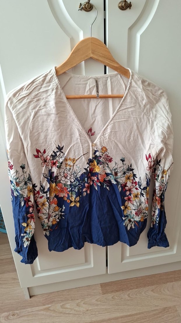 Bohem tarzı, uzun kollu, bol kesim bluz. V yaka, düğmeli, beyaz ve lacivert çiçek desenli, pamuklu yumuşak kumaştan. Günlük kullanım için uygundur.