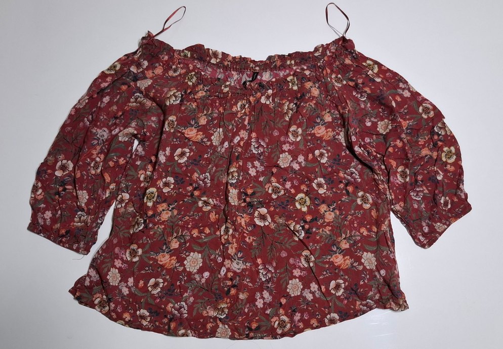 Sayılı kez giyildi. Herhangi bir kusuru yoktur. Bordo renkte, kayık yaka ve yarım kollu, çiçek desenli, fırfırlı bohem tarzda bluz.