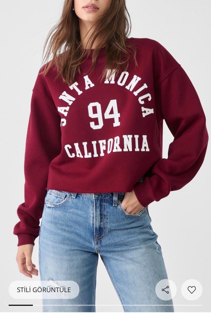 Bordo renkte, yuvarlak yakalı, uzun kollu ve bol kesim kadın sweatshirt. Üzerinde 'Santa Monica 94 California' baskısı bulunan kot görünümlü kumaştan yapılmıştır.