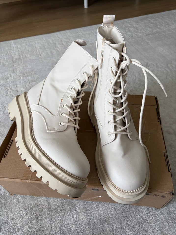 stradivarius postal bot krem renkte sadece 1 kere kullandım yeni gibidir, son fotografa ekledigim lekesi dısında hicbir kusuru yoktur o da zaten cok minik bir leke muhtemelen çıkacaktır, makul tekliflere açığım