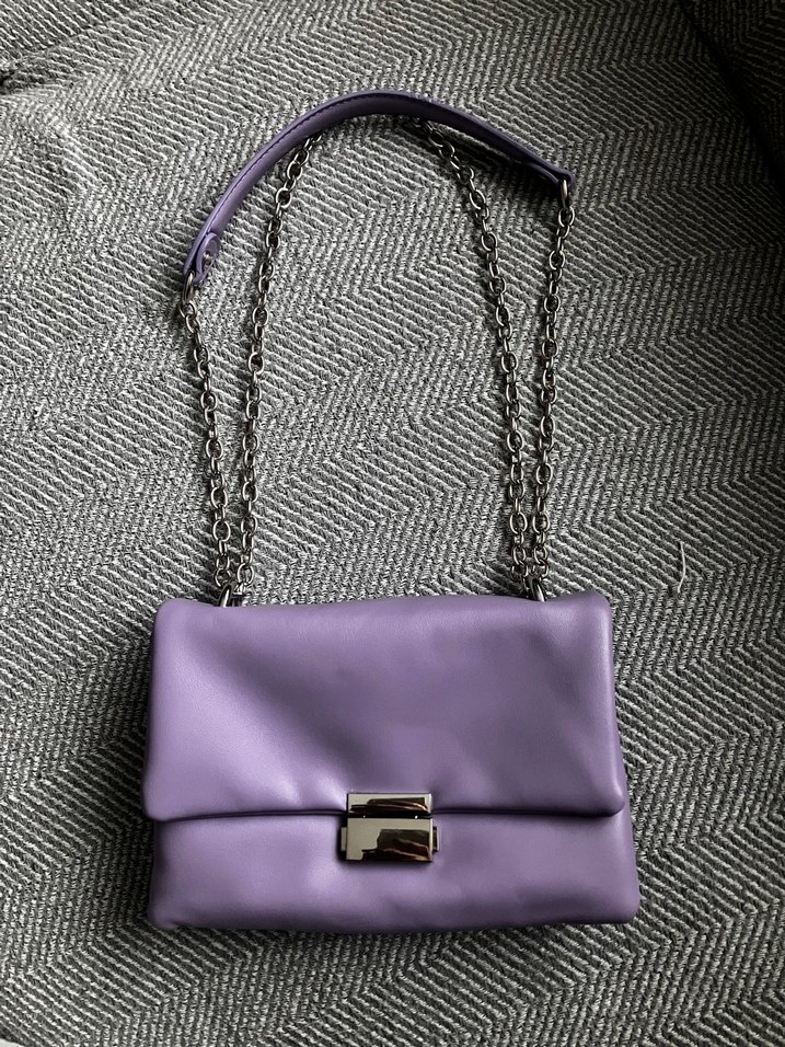 Pastel mor renkte tokalı, zincir askılı kadın çantası. Düz, yumuşak sentetik kumaştan, günlük kullanım için uygun. Paris sokak modasına uyum sağlar.