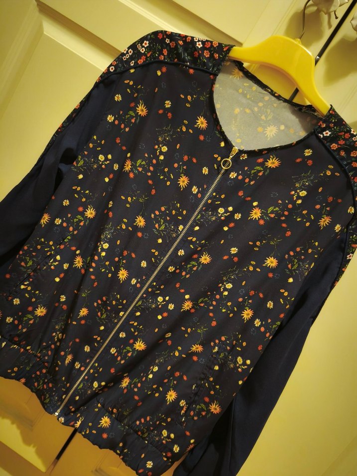Sentetik kumaştan, fermuarlı ve yuvarlak yakalı, bol kesim çiçek desenli koyu renkli ceket Günlük kullanıma uygundur.