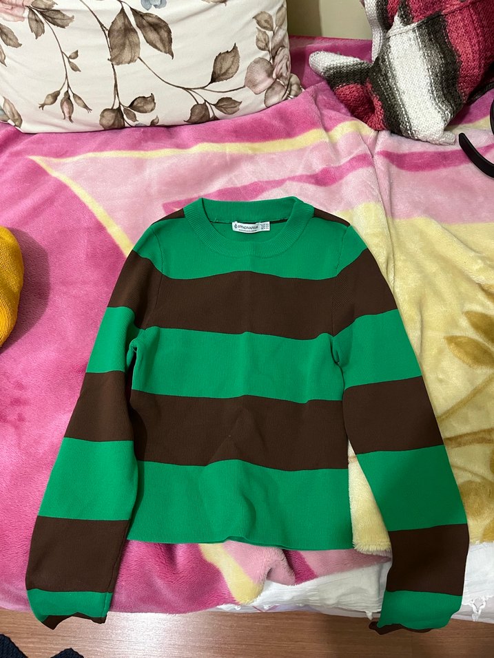 Fitted kesim, uzun kollu kadın triko. Yuvarlak yaka ve kalın yeşil-kahverengi çizgili örgü kumaştan yapılmıştır. Rahat ve şık bir görünüm sağlar. Geçen sene stradivariustan almıştım hiç giyilmedi kilo aldığım için kaldı öyle hiçbir defosu yok dolapta duruyor