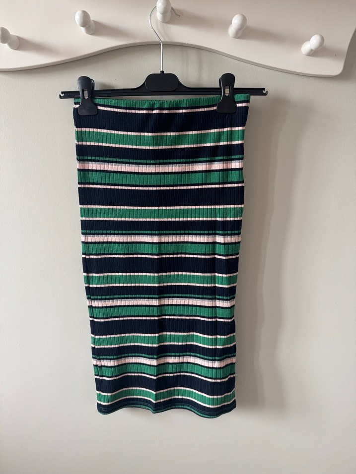 Esnek kumaştan yapılmış, çizgili, dar kesim uzun etek. Koyu çok renkli tonlarda, günlük sokak stili için uygundur.