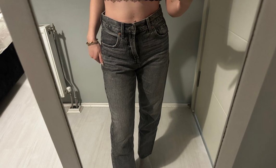 Gri renkte, midi boy ve bol kesim kadın kot pantolon. Kot kumaştan üretilmiş, tokalı detaylara sahip günlük rahat stil için uygun