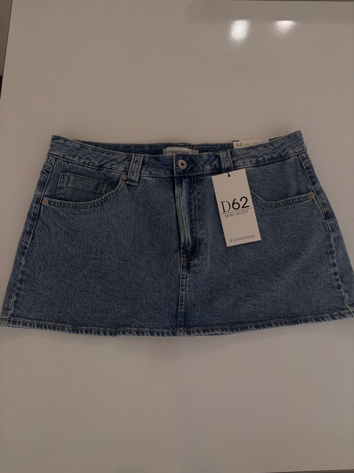 Bu mavi kot mini etek, rahat oturuşu ve baskılı detaylarıyla gündelik sokak stiline uygun, şık ve zahmetsiz bir görünüme sahiptir. Etiket üzerinde 'D62' yazmaktadır. Hiç kullanılmamıştır.