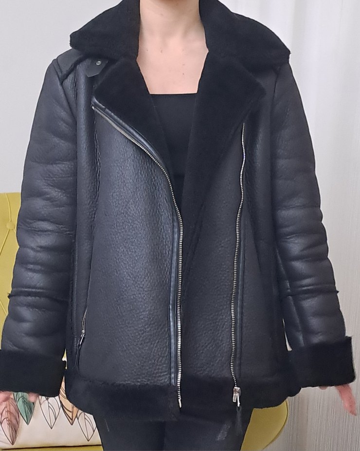 Siyah deri biker ceket, kürklü geniş yakası ve bant detaylı kolları ile midi boyda, rahat kesimdir. Çok sıcak tutar hiç bir kusuru yoktur.